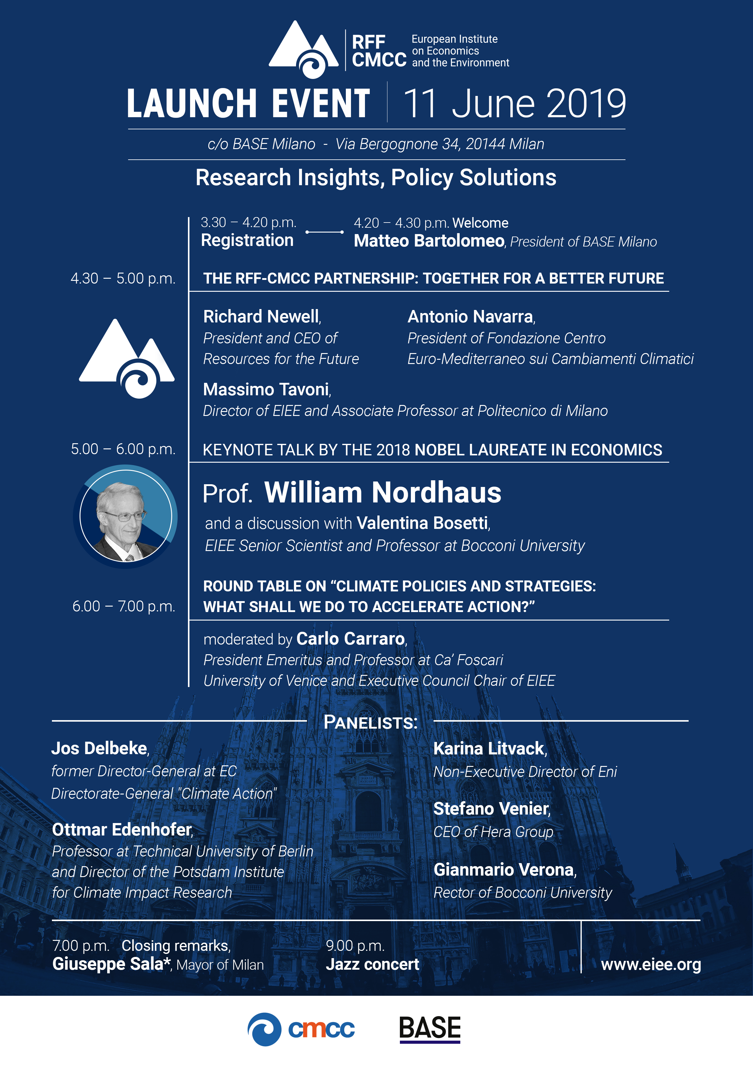 The launch of RFF-CMCC EIEE will be take place oInvitation 11 June 2019 n 11 June 2019 in the presence of both presidents of RFF and CMCC. Furthermore, the event will be honored by the presence of Prof. William Nordhaus, 2018 Nobel Laureate in Economics for his contributions on the relationship between climate change and economic growth.